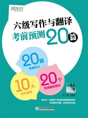 《六级写作与翻译考前预测20篇》为新东方考研写作一线教师王江涛依照新版的英语六级考试大纲编写而成,全书共分为两部分:六级写作考前预测20篇、六级翻译考前预测20篇。写作部分包含20篇预测作文,涵盖人生哲理类、教育文化类、环境保护类等热点,以及情景作文、图画作文、图表作文等题型,涵盖了六级写作部分的各类可考话题。图画作文是六级写作的常考重点题型,本书包含5幅原版引进的押题漫画,为四六级真题漫画原创者的新作,将大幅提升预测的命中率。除了预测20篇题目,给出相应的范文、词汇、点评和句型扩展,作者还悉心总结了十大写作框架,归纳了六级写作词汇,帮助考生丰富作文内容,在考场上快速组句成篇。翻译预测同样包含20道预测题目,中文段落的选择话题广泛,依照历年真题的套路精选精编而成,英文译文则通顺地道,考生在背诵过后,即使面对从未翻译过的文章,也能写个八九不离十。在翻译预测题目的后面同样附有翻译必背词汇供考生参考学习。书中的20篇预测范文和20篇预测翻译邀请专业外教朗读MP3音频,读者可以边听边记,将这些金句印在脑海中,以便能在考场上厚积薄发,挥洒自如。